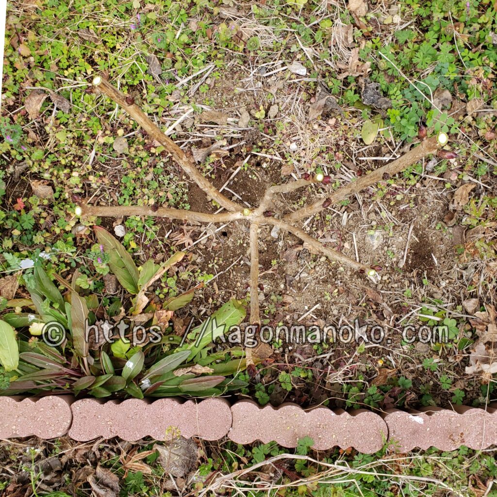 この太い幹は株立性低木の特徴で株や古枝が新しく更新するためにに伸びている枝なので大事にします。地面から出ている冬芽は将来、左側の太い幹のように成長していきます。冬芽が地面から出ているので古い枝数を剪定で減らしても大丈夫です。