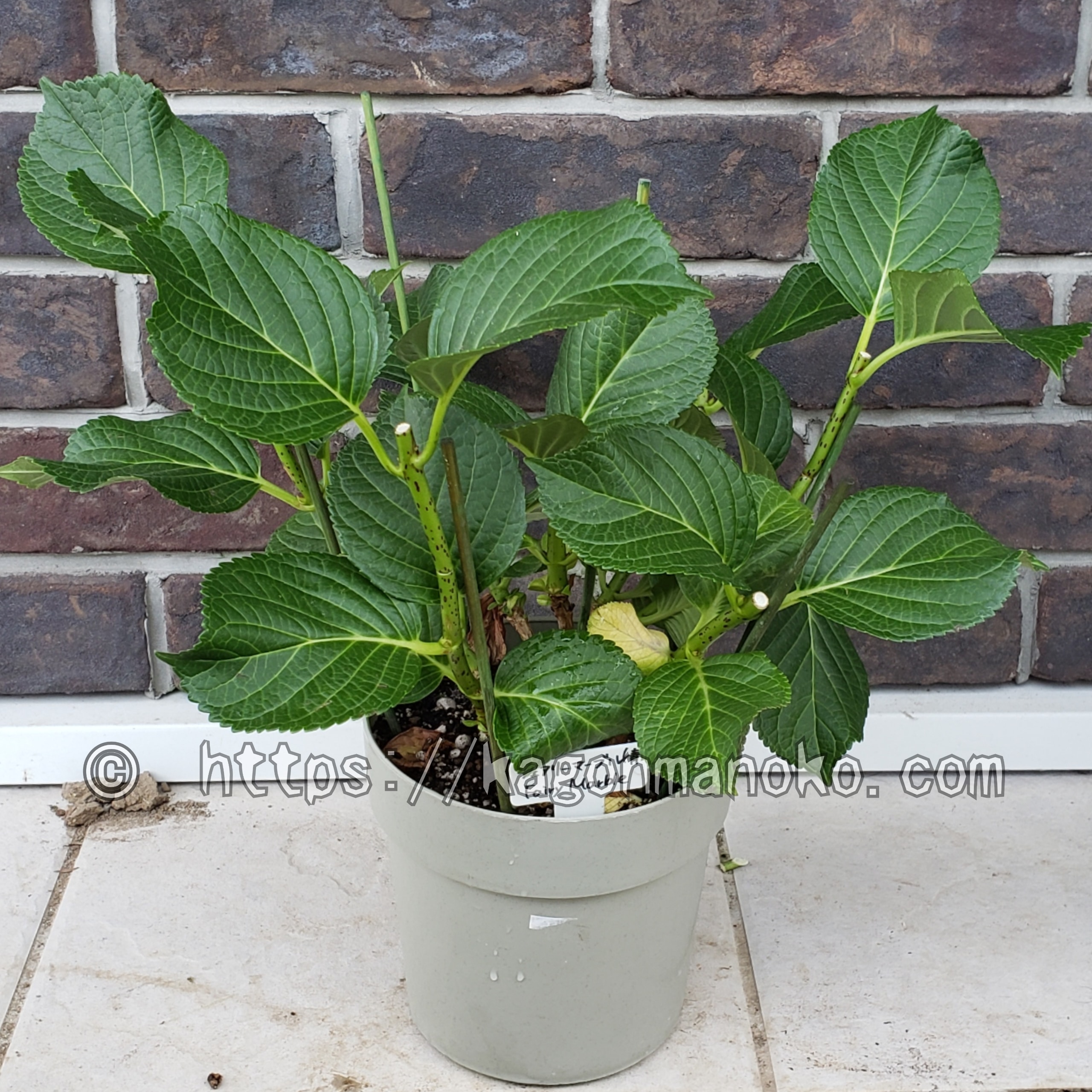 見立てた購入した株をアップします!こんな株がおススメですよ。剪定後も葉が茂っていますが、1ヶ月経つと根詰まりのため葉が1枚黄色くなりました。根が張っている健康な紫陽花だったということです!