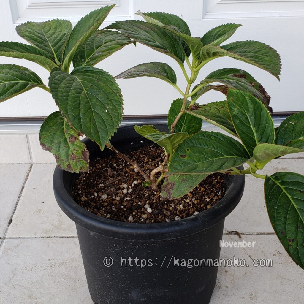 11月の紫陽花は、緑色の大きな葉が元気に育っています。少しずつ肌寒さを感じる時期ですが落葉する気配も、枝の先端に花芽の分化も見られません。もしかして、我が家の紫陽花だけ落葉できていないのかな・・・とちょっと心配し始める頃ですね。