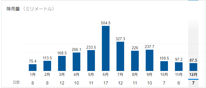 次は、落葉と降水量の関係について検討してみます。落葉をし始めた12・1月は、1年間の中で最も降水量が低く、雨が降っていないことが分かります。晴天でかつ北風が吹く冬の気候は、乾燥した日々が続くため紫陽花にとって苦手な日が続いています。(まぁ・・・だから冬越しするために休眠するんだよね。)雨が降らないことで乾燥した空気と風により葉の水分が抜けてしまい、葉が乾燥し枯れることで、落ち葉みたいにパリッと割れやすい葉になることも落葉しやすい一つの要因だと考えられます。