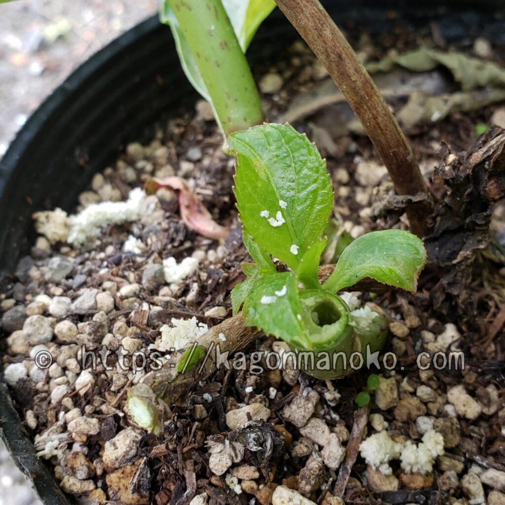 それから、コウモリガの食害にあったら、ためらわずに茎を切るようにしましょう。たまに針金で虫を指して駆除するという方法が挙げられていますが、私には虫を刺してしまうのは気持ち的に無理なのでこの記事では割愛させていただきます。茎髄が食べられた空洞の茎は、栄養分が行き留まってしまうので、枯れたり、折れたりしてしまいます。コウモリガの幼虫に食べられた茎や枝の寿命は短く、長く育った実例はないようです。