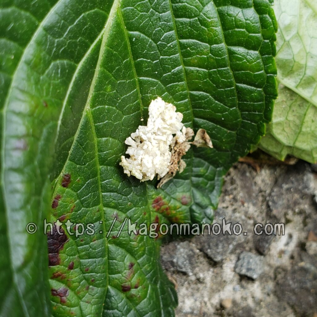 それでは、コウモリガの幼虫による食害にあった紫陽花の様子を見ていきましょう。幼虫も現行犯で捕まえたので正体のお顔も載せています。