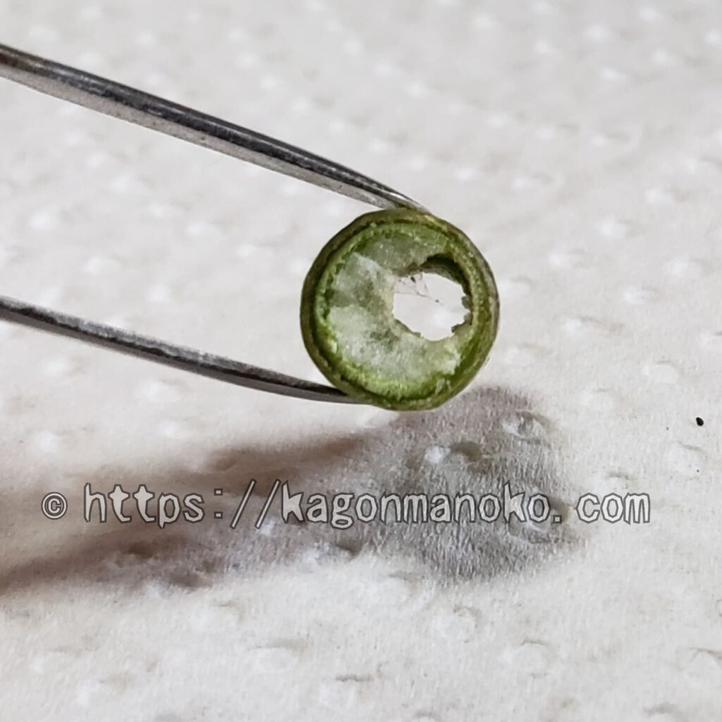 茎に白色の小さい米粒みたいな塊がいっぱいついていて、軽く取り除くと茎に穴が開いていました。この茎に侵入するために開けた穴は、「排出孔(はいしゅつこう)」と呼ばれています。