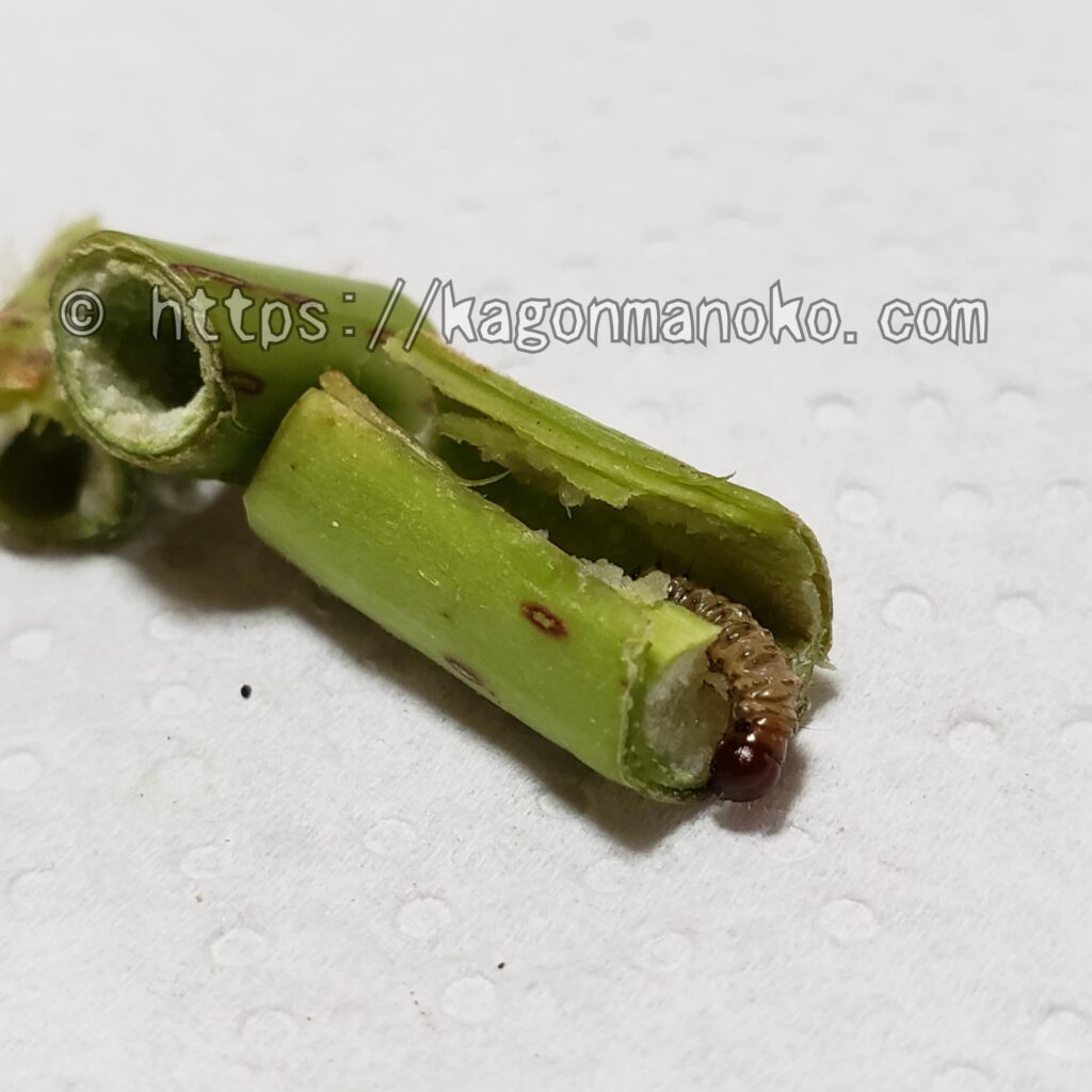 「さようなら、幼虫さん!今まで茎を食べれて美味しかったね」とお別れの言葉を伝えました。さて、この幼虫の種類は食害の特徴と幼虫の様態より「コウモリガの幼虫」と推測されます。特徴は、体の各節に褐色の斑紋があります。