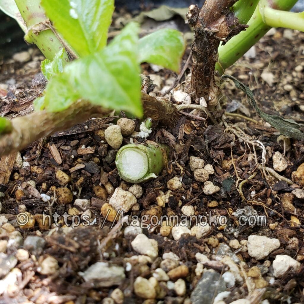根本付近まで茎を切って、やっと元通りのキレイな茎の髄が見えてきました。結局、8㎝ぐらい茎を食べられていました。もう少しで紫陽花の土台の幹に被害が及ぶところでした。