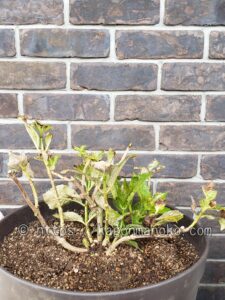 ちなみに、剪定をした’細くて長く伸びた木質化した枝’ですが、捨てるのがもったいなかったので挿し木にしました。親株が枯れるほど寒い3月なので発根はできないと思いましたが、発根に成功しました。
