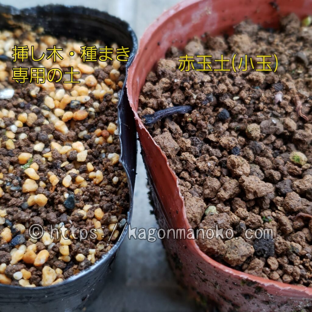 そこで、おススメしたい挿し穂に向いている土は、赤玉の小粒もしくは、挿し木・種まき専用土です。両方とも使いましたが、正直言えばどちらとも発根します。赤玉土に鹿沼土を混ぜてもよいです。