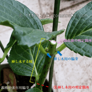 開花後の剪定から1~2週間すると脇芽(青色の矢印)が大きくなりぷっくり成長してきます。大きくなった脇芽を確認してから挿し穂用の枝を確保するためにさらに剪定(赤色の点線箇所)します。 - ②挿し穂用の剪定をします。