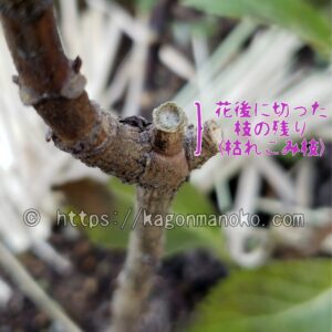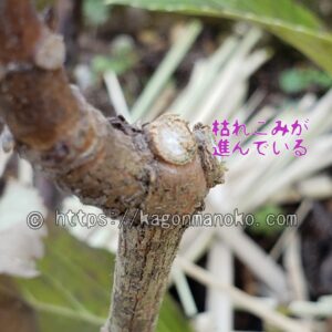 花後の剪定をする際に、脇芽ぎりぎりで剪定をした枝の名残です。ちなみに、左側の脇芽は伸びて枝も充実していますね。すでに木質化も進んでいます。