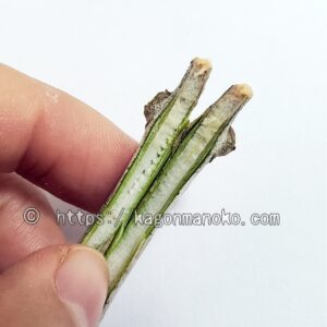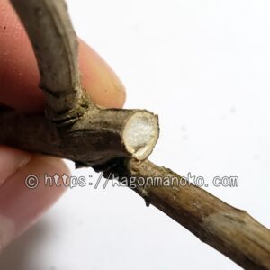 花後の親株を剪定した切り口は、今年の伸びた枝のため幹が充実してない(木質化が進んでいない)若々しい枝です。
