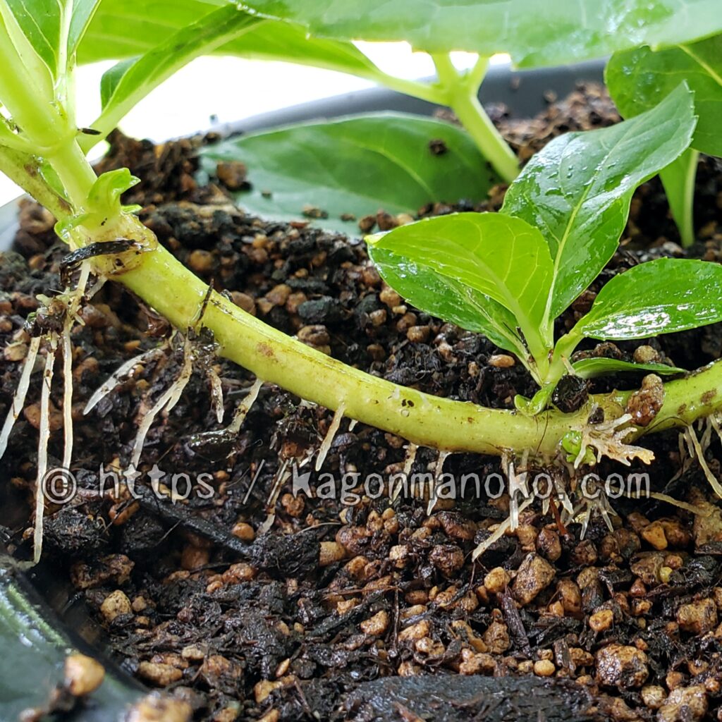 開花後の紫陽花を剪定し、植え替えをした後にとり木をしました。時期は6月上旬でした。それから約1か月後の7月上旬に発根が確認できました。