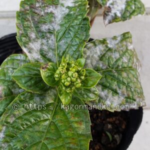 - 周囲にアジサイ科、ユキノシタ科の植物がうどんこ病に感染してその菌が風に舞って飛んできた