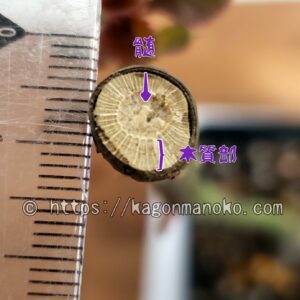 大苗の枝の切り口を見て、木質化を確認します。木質化は、植物体内にリグニンという物質が蓄積することで枝が茶色くなり木のように硬くなる現象です。リグニンは、植物の細胞間を埋めて強固する作用により丈夫な組織に変化させる役割があります。