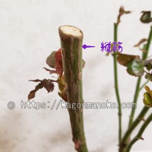 枝の樹皮を見ると、緑色の樹皮の細胞繊維に沿って、縦に茶色の筋(縦筋)が入っています。これは縦縞と呼ばれています。堅く締まっている枝である証拠です。