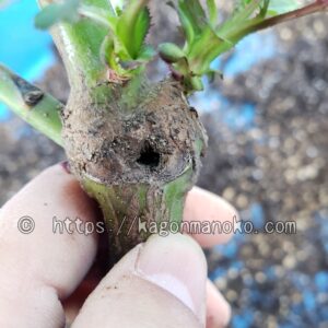 大苗からすでに芽や葉がでている場合、変色や虫食いの有無を確認します。枝や葉に卵を産みつけふ化した幼虫が髄を食害しながら越冬する害虫の被害に遭っていないかを調べます。薔薇ではテッポウムシの被害がありますね。害虫による食害を受けている穴であれば、穴の周囲に木クズがついています。一方で枝の剪定による枯れ込みから穴が開いてしまった苗もあります。