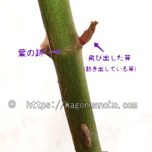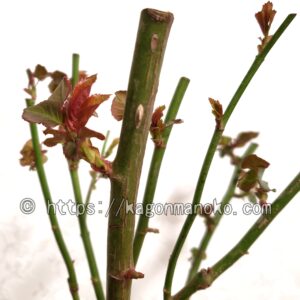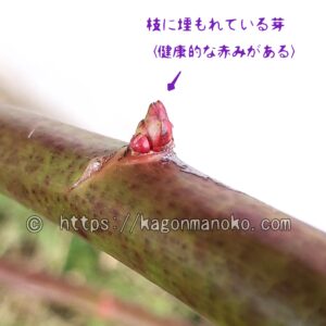 大苗の理想の芽を写真を掲載します。枝から少しだけ顔を出している赤みを帯びた芽がよいコンディションです。