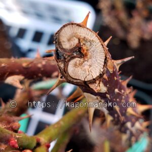 大苗のほとんどは木質化できている枝です。たまに、亀裂が入っている切り口もありますが、元気で太い枝であればカルスが形成され自己防衛反応が働いているので正常な枝と言え、特に問題ありません。見た目は心配ですが、太い枝からは後ほど更新用のシュートが発生していきますので、枝を更新していけば、亀裂という見た目は気にすることがなくなります。