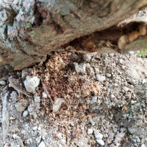 バラの根元におがくず(木屑)を見つけた時に、初めてバラが被害に遭っていると気づきます。8月中旬が過ぎたころ、バラの根元に木屑が盛り上がっています。