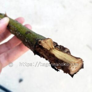 テッポウムシの食害に遭った薔薇の幹は手で押すと柔らかくなっていてブニュブニュしています。髄が食べられて空洞になっているので外側から指で押すと圧でへこむんです。テッポウムシは下(根元)から上に移動しながら髄を食べながら進行しています。そこで、根元が食害に遭っている枝に幼虫が住みついていると想定される幹を根元より剪定しました。