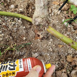 殺虫剤のノズルは3方面からなので、側面の穴から噴射されると直接バラの幹に強圧な噴射が当たってしまいました。直接噴射が当たった幹は薬害の被害がでるのではという疑問が一つと、テッポウムシの食害跡を追っていくと食害している道は真っすぐではなく、根元の株をグルグルと円を書きながら上に食害しているので、スプレーの効果がらせん状を潜り抜け、その先に居る幼虫まで行きわたるのかという2つの疑問がありました。