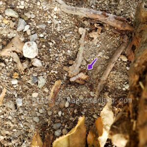 そして、針金でテッポウムシを幹の外に追い出しました。幼虫が地面にぽつりと落ちたのです。