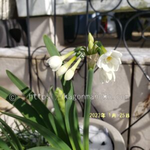 植付けをしたのは10月下旬。10月下旬は鹿児島は暑くて、植えた球根が傷まないか心配でしたが日陰に置いていたこともあって球根は傷むことなく1月に開花しました。植え付けから約3か月でキレイな水仙の花を見せてくれます。