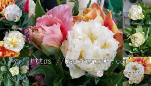 白色とサーモンピンク色の花びらが交互に重なる八重咲き水仙。品種名の Replete は「満たされた」という意味。花びらがぎゅっと詰まった感じではないのでふわっとした優しい印象を受ける花の咲き方をしています。一方で花びらが薄いため雨が降ると傷みやすく、花びら同士がくっついてしまったりうつむいてしまう傾向があります。花は直径5~6㎝あり、大型水仙に分類されています。テテブークルが咲いた後にレプレット、同時にミレーナが咲き始めました。