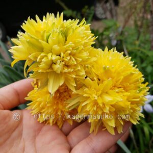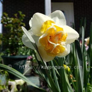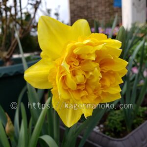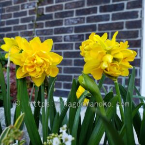 黄色の八重咲き水仙で花が大きく4~5㎝あります。咲き始めは雨が降っても真っすぐ自立してしますが、咲き終わりで雨が降ると茎が倒れてしまい花がうつむいてしまいます。切り花としても長持ちします。球根が小さいとその年は葉だけが伸びて花は咲きませんが、大きめの球根ですと見事な水仙を咲かせてくれます。開花時期はバラバラなので、同時に数個の球根をまとめて植えても同じタイミングで開花しない場合もあります。一度は育てたい水仙の一つ。