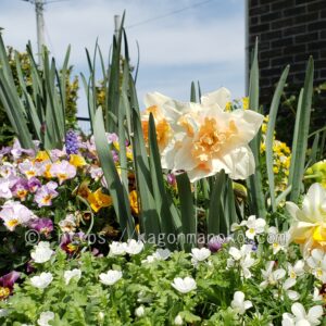 花は真っ黄色一色で花びらにほのかに緑色が入っている八重咲きのミニ水仙。草丈も15㎝程度で寄せ植えにしやすく管理がしやすいため育てやすい品種と言えます。切り花として花瓶に挿した後は日持ちがせず花が傷みやすいが、植えたままの状態での開花だと1週間程度花を楽しむことができます。ビオラやアリッサム、ムスカリと開花時期が揃うため寄せ植えがしやすいです。数個の球根を植えても、開花は揃うことが多いため一度に多くの花が咲いている状態を楽しむことができます。
