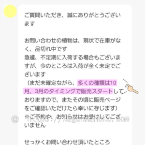 再販時期について、おそらく問い合わせ先の仕入れ状況というよりは宿根草が出回りやすい時期、販売数が多くなる時期という意味だとだと思います。