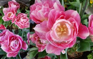 品種を選ぶ斑入りとチェリーピンクが美しいトップリップスは大人色のチューリップチューリップの花と葉の外淵の色が違い2色入っていることが特徴の一つであるトップリップスの開花の様子をご紹介します。 販売時冬品種球根チューリップ