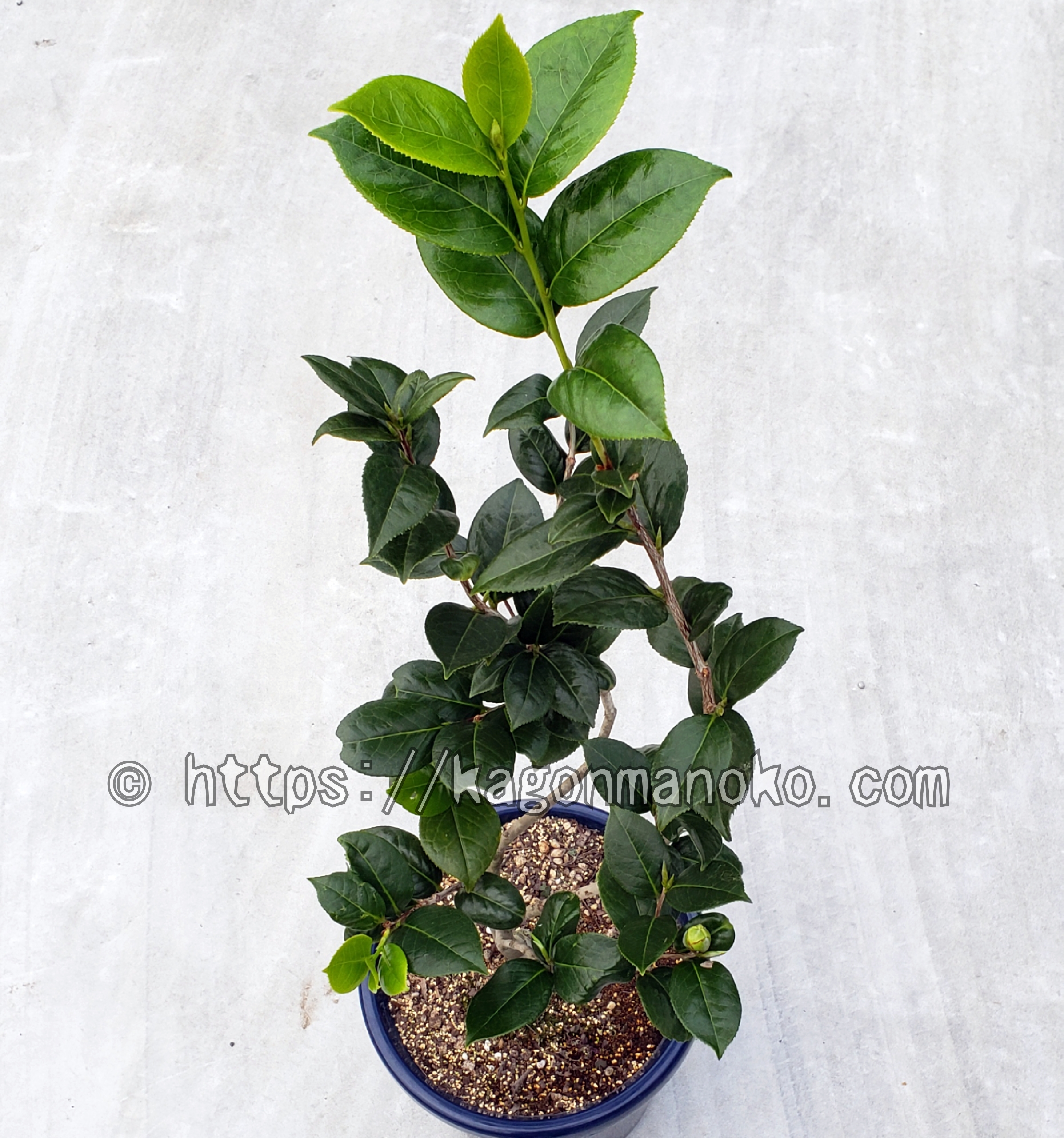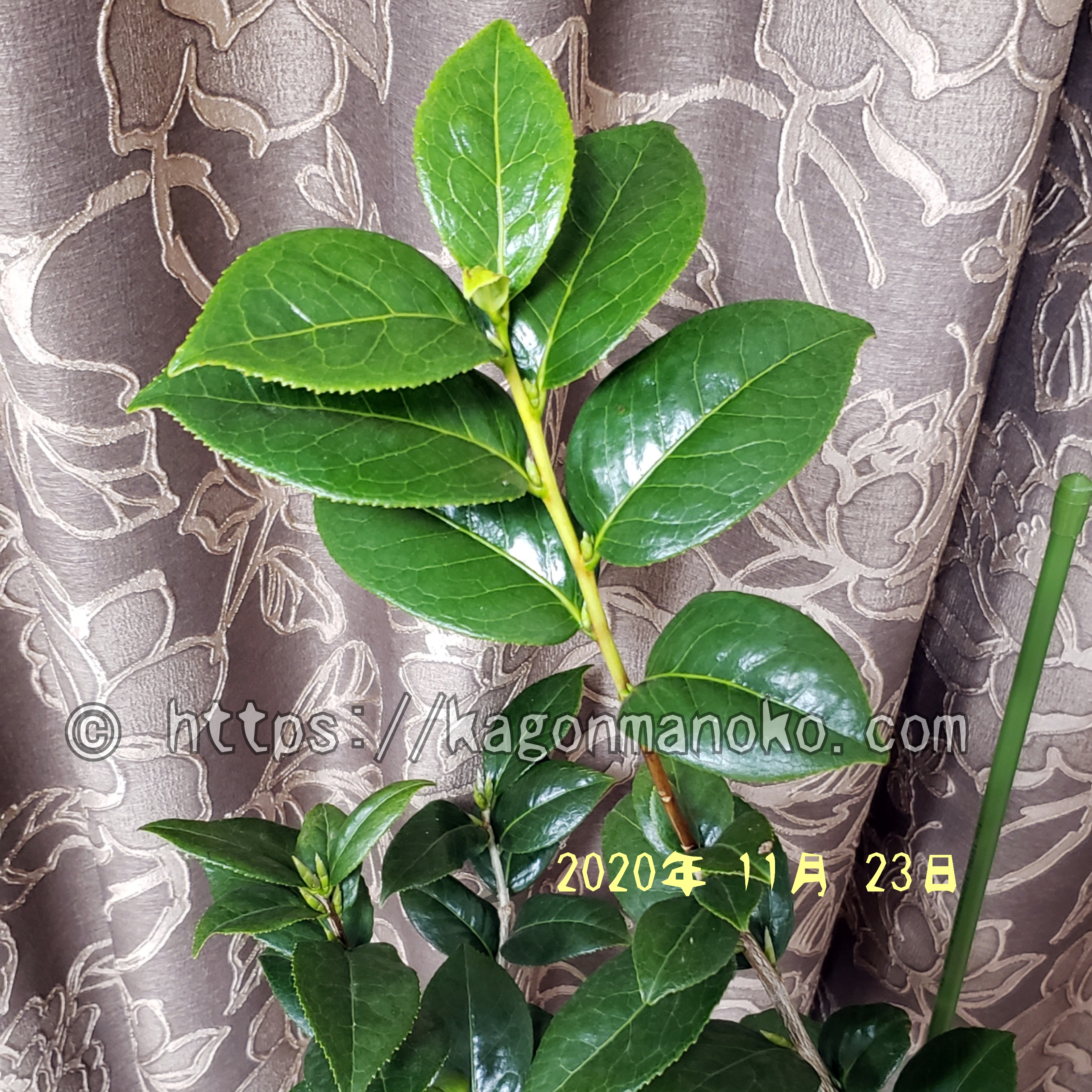 10月下旬になっても葉芽を伸ばしている椿です。鉢植えで、屋根のない野外で育てています。購入してから2か月目の椿で、接ぎ木3年生です。赤みを帯びて小さめな葉が開いています。