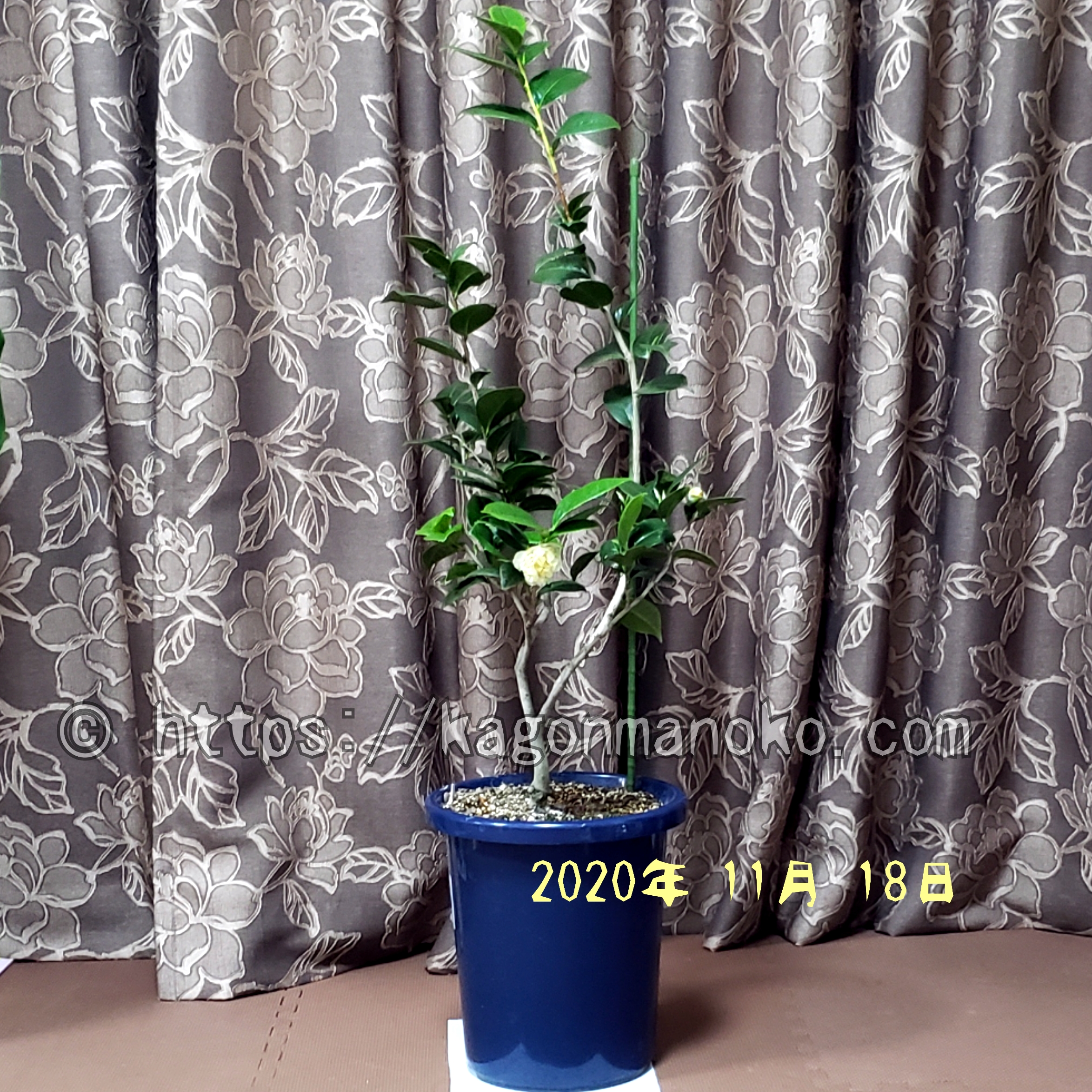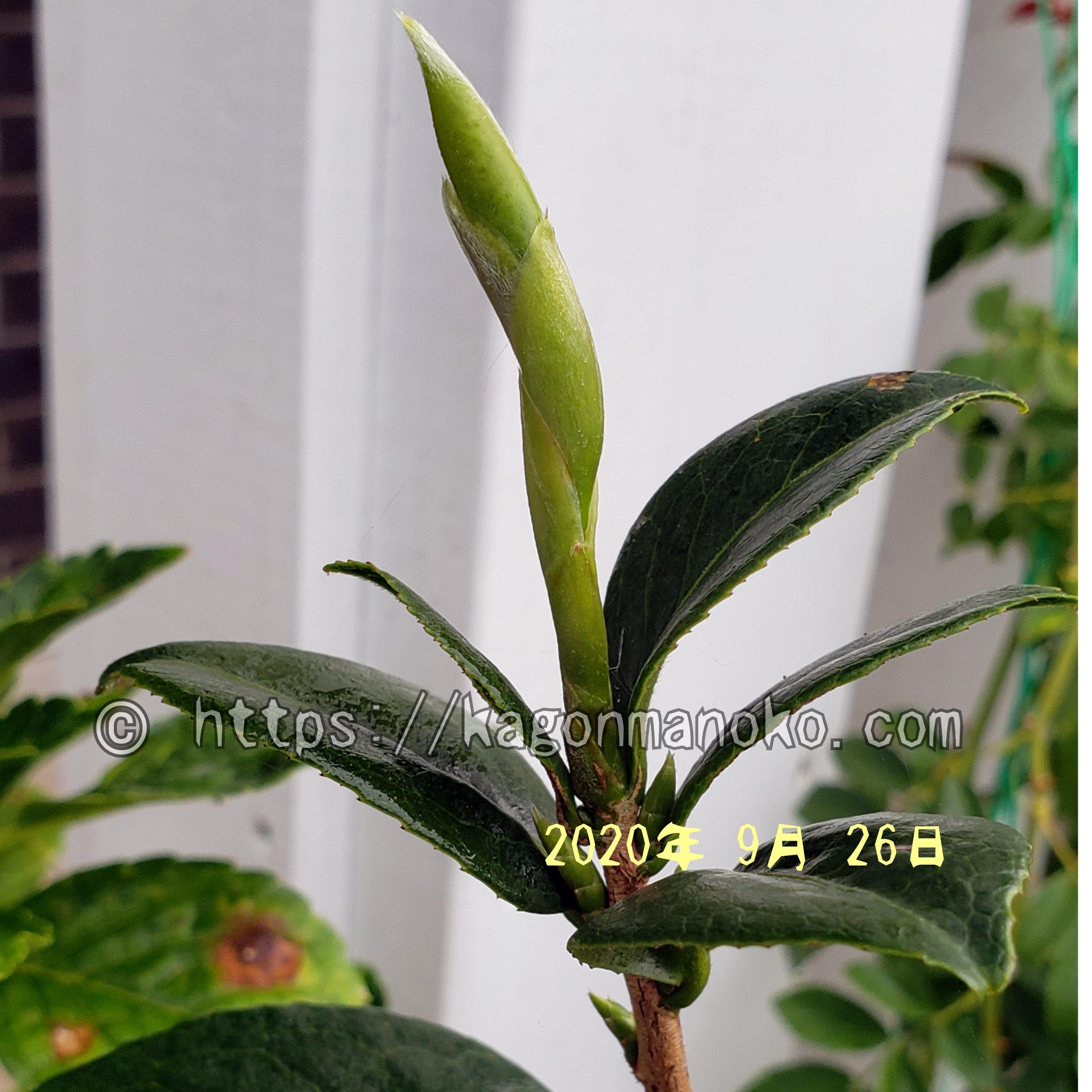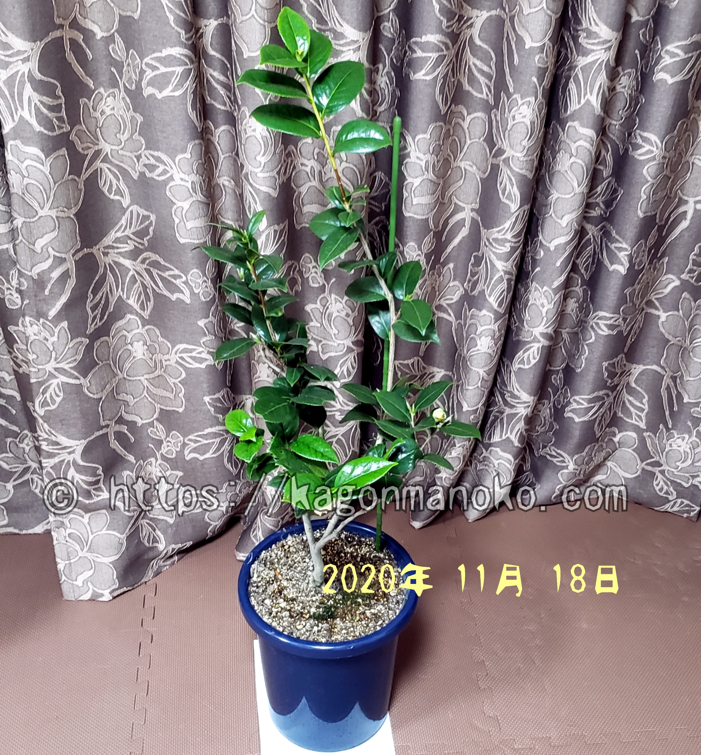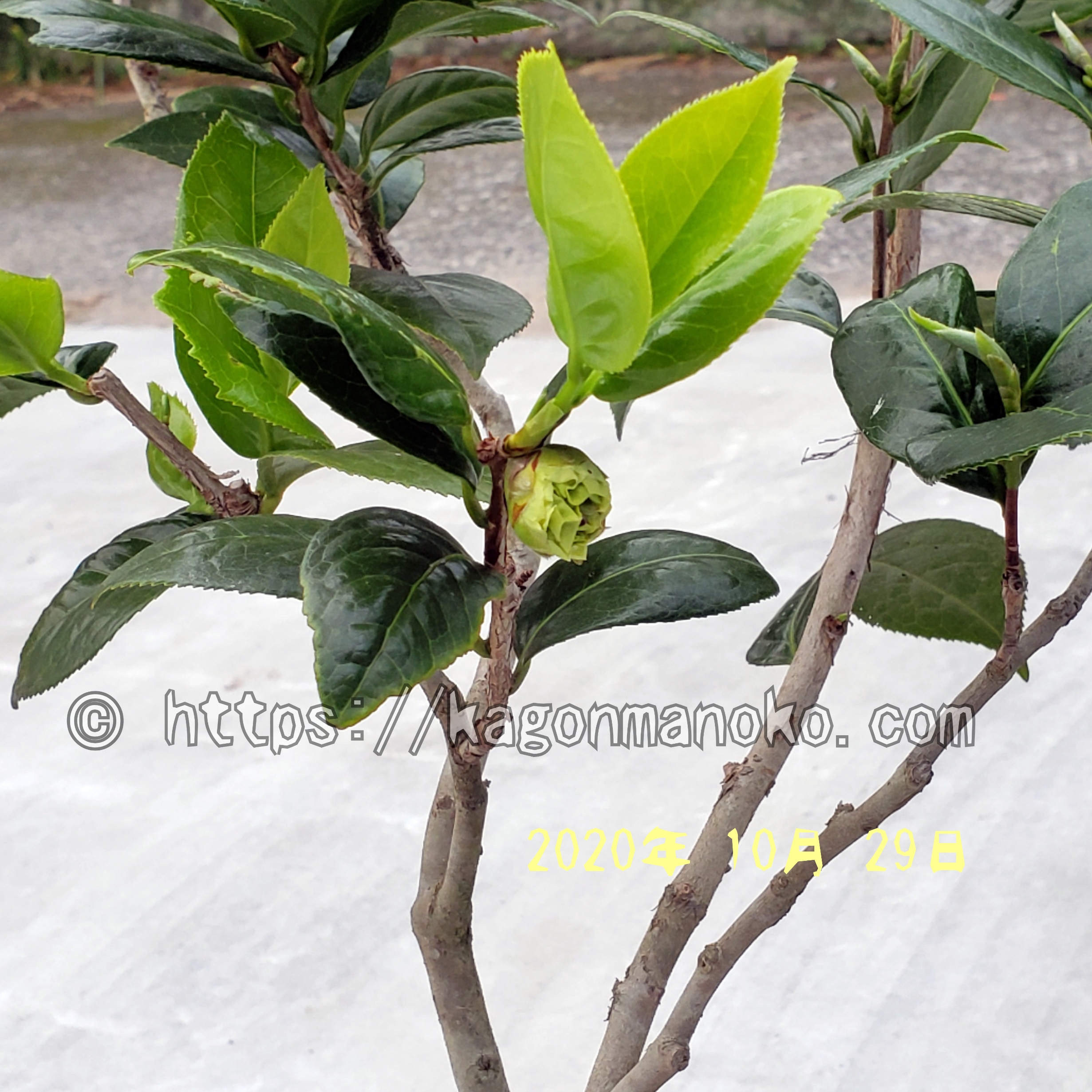 10月下旬では蕾がだいぶ膨らんできました。蕾の充実と同時に、蕾の上から新葉が開いています。蕾を育てながら、新葉も伸ばしてとても元気な樹木であることが分かりますが、10月下旬は最低気温が15℃以下のため、日中はテラスで管理し、夜は玄関内に椿を移動させています。葉が傷まないようにできる限り、風当たりが少なく、雨よけができる場所で日光に十分に当ててあげ光合成をさせます。日光に適度に当てることで葉も強くなり丈夫になります。