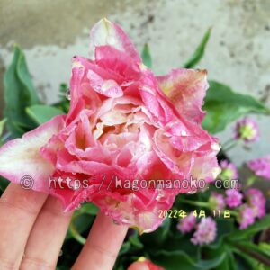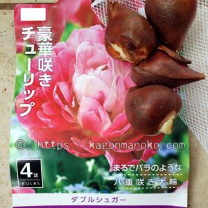 ダブルシュガーの特徴はパッケージ通りの薔薇に似た花が咲きます。花弁が多く透き通ったグラデーションのある花柄は一度見たら忘れられない花色で神秘的です。開花時期は4月~5月で地域差がありますがチューリップの中では遅咲きに分類されています。草丈は約30㎝、伸びて50㎝になると記載があります。