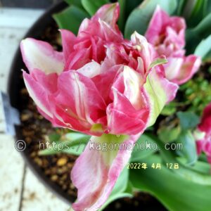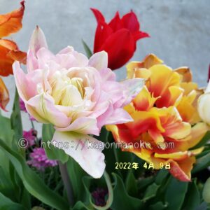 さらにもう一枚、写真の載せます。(中央のチューリップ:ダブルシュガー)スマホ撮影でここまで美しいチューリップが撮れるなんてと感激してしまいます。スマホ機能もですがチューリップが持っている写真映りがよい配色により一層魅力をおぼえます。ダブルシュガーの右下に映っているピンク色の八重咲きチューリップはアンジェリケという品種です。