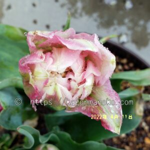 開花4日目のダブルシュガーの開花の写真をたくさん載せてしまいました。ご覧になっていただきありがとうがございます。実は前日の開花3日目は1日雨が降っていたんです。それにもかかわらず開花4日目のダブルシュガーはとっても愛らしく可愛らしい姿を見せてくれました。まだまだダブルシュガーの可愛さをお伝えします。次は、1日遡って雨が降った開花3日目の花の様子をご紹介します。