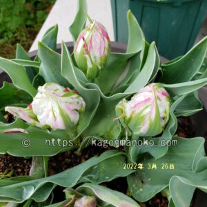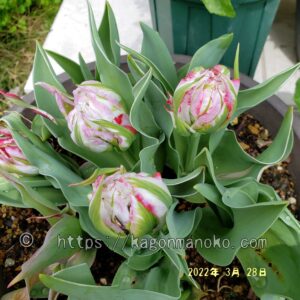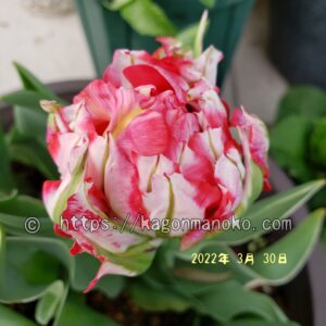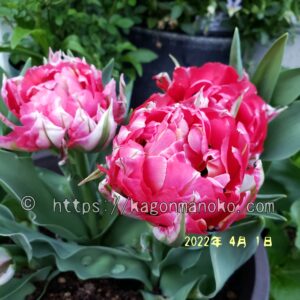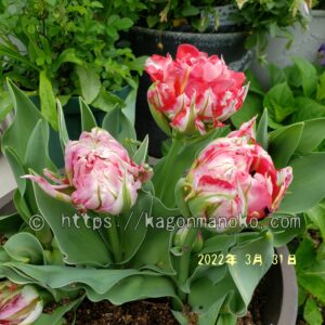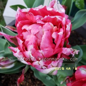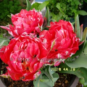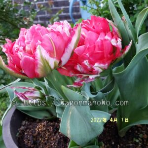 正直、実際に咲いたチューリップは表示ラベルの印象と違っている気がしますが、実際に咲いた方がチューリップとは言えないほど迫力がある豪華な八重咲きと色合いを兼ね揃えているように感じます。チューリップというより牡丹に近い咲き方をしています。