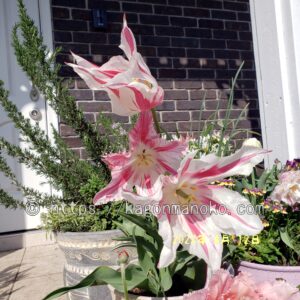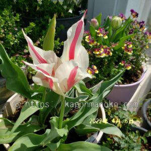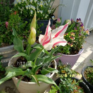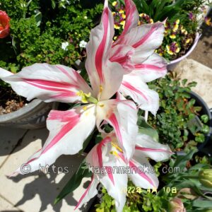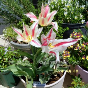 マリリンは草丈が高く40㎝ほど伸びますので、鉢植えので寄せ植えをしたら立体的な空間をつくることができます。ユリ咲きチューリップは他のチューリップと比較すると開花したら大きな開きをするので迫力がありイイ感じですね。