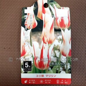 マリリンの特徴は、咲き方と花色に特徴があります。チューリップとは思えないユリ咲きで、白地に躍動感ある赤色の筋が入った明るい花色をしています。蕾の時からユリ咲きであることが分かり、花びらの先端はシュと細く尖がっています。開花につれて草丈が長くなるので切り花にできますが開花した時の花の広がり方が大きいので花束にするときはマリリンをメインにした方がよさそうです。