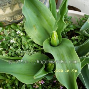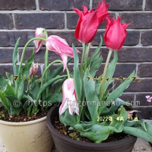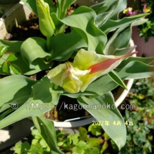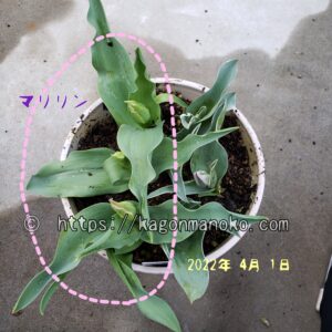 マリリンの開花は晩生(遅咲き)なので同じ晩生であるレンブラント系を寄せ植えしました。レンブラントのチューリップも蕾が見えていますが、マリリンの方が開花が早そうです。マリリンの葉は長くて大きいです。