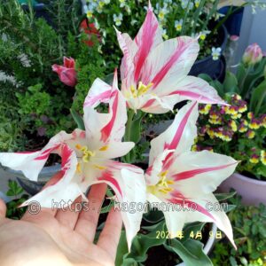 マリリン初開花です。商品パッケージには開花4月~5月と記載がありましたが、4月上旬に開花しました。白色の花弁に赤色の筋が入った大きくスレンダーな花弁が上品です。各花弁に赤色の筋が1本ずつですが、咲き進み開花日数が経つにつれて模様が広がってきます。