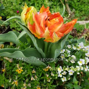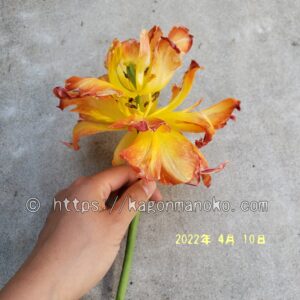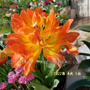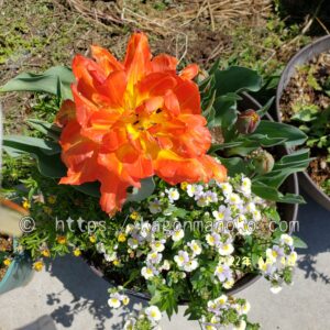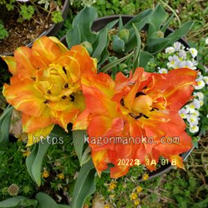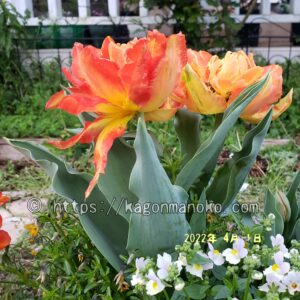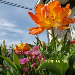 モンテオレンジが開花した数日後から赤色の八重咲きチューリップであるフラッシュポイントが開花しました。一緒に育てて花瓶に飾ること、いっそう華やかなチューリップを観賞することができます。