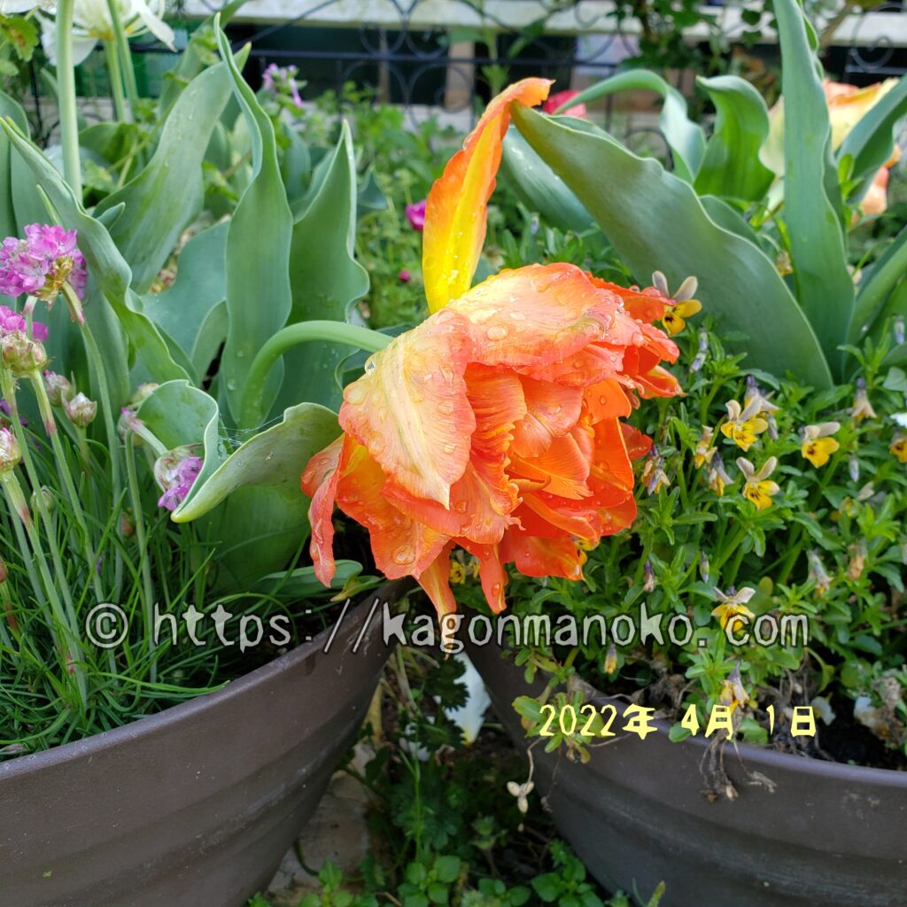モンテオレンジの花を見れて次の日は小雨。それでもお日さまの光に向かって茎を伸ばし、花びらを広げる準備をしているチューリップ達。開花2日目になると花弁のオレンジ色が少し濃くなり面積も広くなりました。徐々に薄黄色から鮮やかなオレンジ色に変わりつつあります。