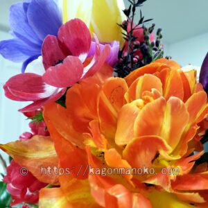花瓶に飾っても花びらが落ちることなく鮮やかさが美しい。花束にすると結構場所を取ってしまいますが、オレンジ色のチューリップが1本あるだけで栄えがある花束に仕上がります。