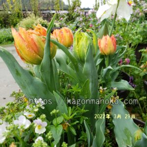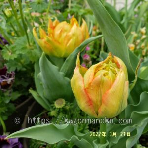 3月下旬になると蕾が膨らんできています。八重咲はぎっしりとした蕾。モンテオレンジの花色は濃いオレンジ色ですが、開花前の蕾は優しい黄色でオレンジ色が花弁の縁からにじみ出ています。商品パッケージと比べると全く印象が異なるかなと思いますが、これから徐々に深く濃いオレンジ色に変わっていきます。モンテオレンジの蕾は、愛らしく優しい雰囲気を漂わせてくれますね。背丈は20㎝ぐらいで低めですがチューリップは開花してからも茎が伸びていきます。
