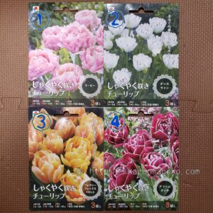 しゃくやく咲きチューリップと表示がある品種:1.ラ・ビー(ピンク色)、2.ダンスライン(白色)、3.フォクシーフォックストロット(黄色・オレンジ色)、4.ドリームタッチ(濃い紫に白縁)の4種類です。